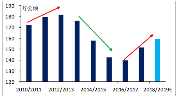 我國甘蔗主產(chǎn)區(qū)廣西實(shí)施甘蔗最低收購價(jià)政策,每年開榨前制定當(dāng)年甘蔗收購價(jià)。2017/2018榨季廣西甘蔗收購價(jià)由475元/噸提高至500元/噸,種植面積進(jìn)一步增加。此外,從歷史上來看,我國糖產(chǎn)量仍處于三年增產(chǎn)周期,預(yù)計(jì)國內(nèi)糖2018/2019榨季供應(yīng)增加。
